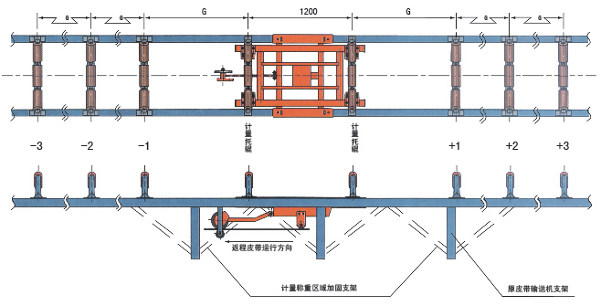說明:1、測速車及測速傳感器 2、稱重架 3、輔助輥 4、稱重橋 5、原輸送機(jī)托輥改制的計(jì)量托輥 5、輸送機(jī)框架